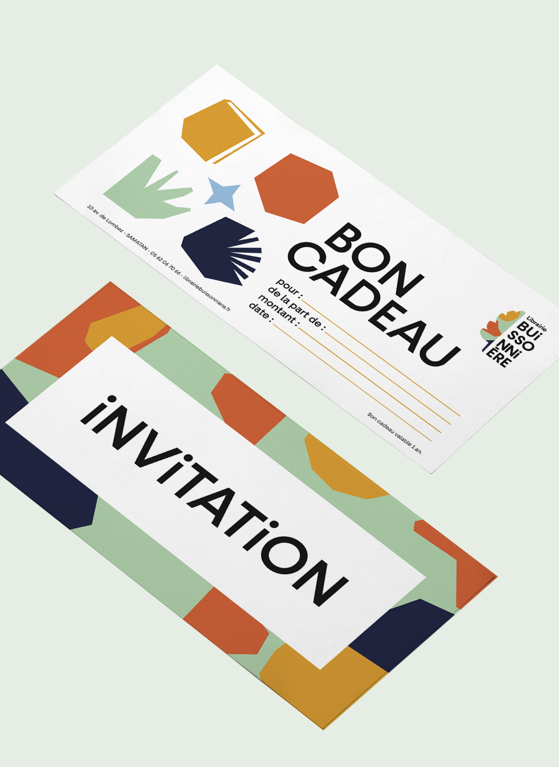 Une gamme colorée et des éléments graphiques forts, déclinés sur les différents supports de communication développés au fil du temps : cartes de visite, marque-page, enseigne, tote bags, tasses et affiches.